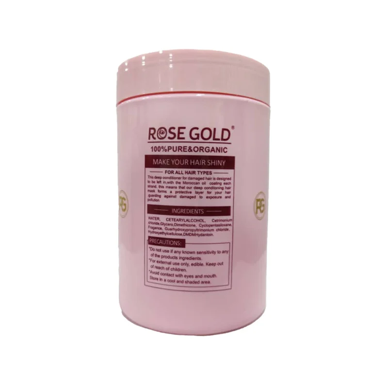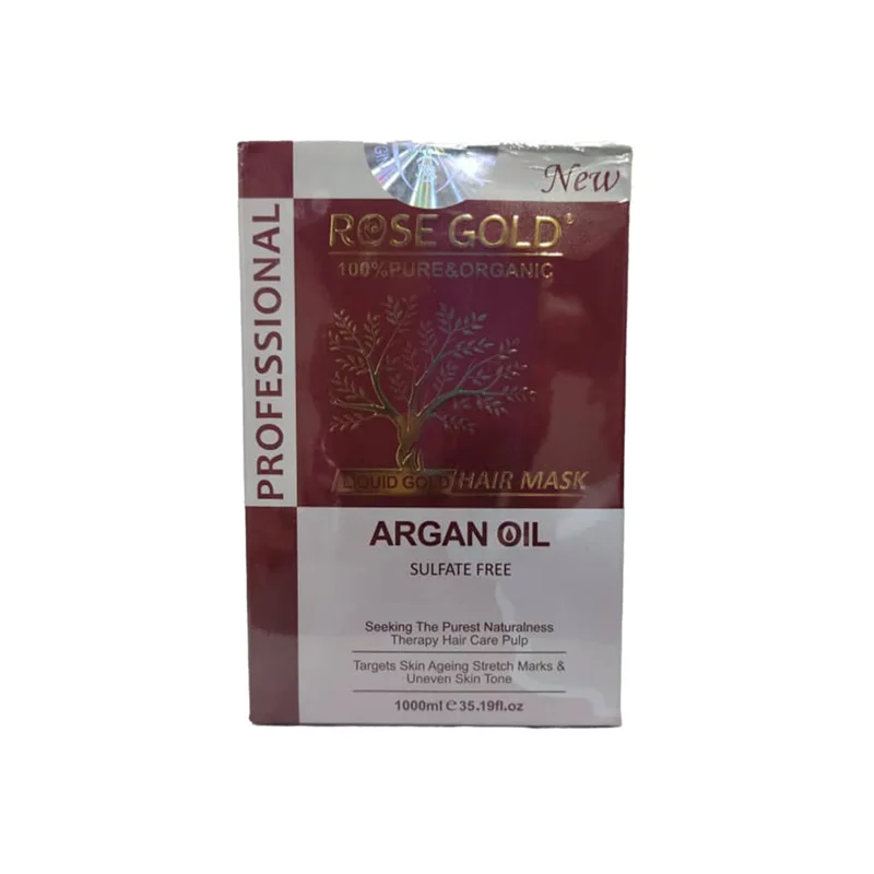ماسک آرگان رزگلد Rose Gold با حجم 1000 میل ساخت کشور مراکش می باشد. یک مرطوب کننده مقوی و مغذی برای مو های شما است. ماسک رزگلد مناسب برای استفاده در حمام است. حاوی مواد آرگانیکی مثل روغن آرگان و روغن بذر کتان است. آسیب هایی که به موهای شما وارد شده است را ترمیم میکند همین طور موها را درخشان ، نرم و ابریشمی میکند. در رشد مو تاثیر بسزایی دارد. بصورت طبیعی به مو آبرسانی می کند و از وز شدن مو جلوگیری می کند. موهای غیر قابل کنترل(وز و خشن) را نرم و لطیف می کند.ویتامین E آسیب هایی را که به دلیل اتوکشی زیاد،حرارت و اکسیدان کردن مو به مو وارد کرده است را ترمیم می کند. به وسیله قرار دادن پروتئین بین ساختارهای مو ، قابلیت درمان موخوره های پائین مو را دارد. شوره سر و خارش پوست سر را درمان می کند و نوعی ضد شکنندگی مو محسوب می شود.